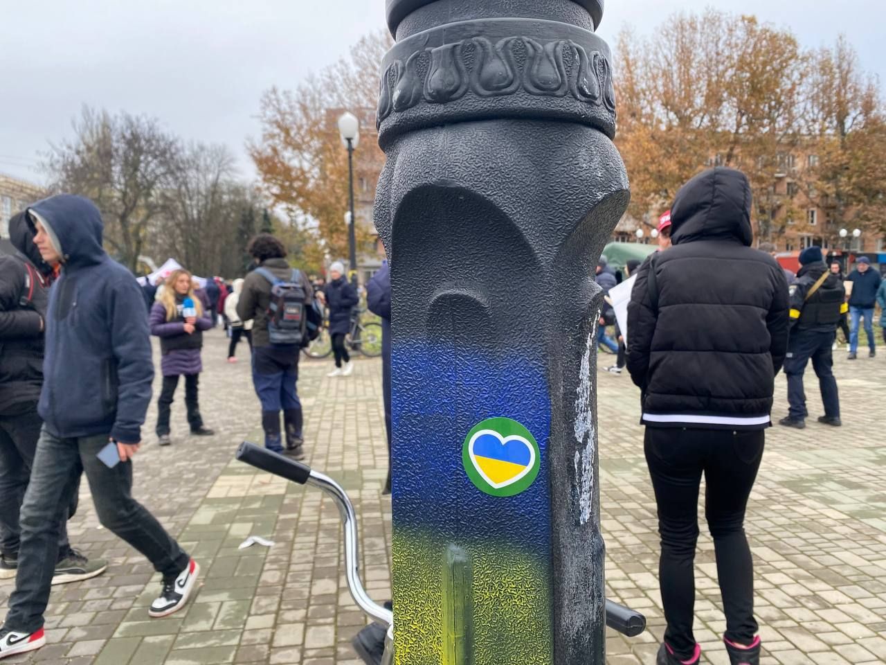 Водители автомобилей сигналят по всему городу, некоторые уже ездят с сине-желтыми флагами. Сколько людей на улице здесь не увидел бы за последние месяцы, но сегодняшний день совсем нетипичный. На площади немало людей с флагами и каждый из них хочет поблагодарить военных за освобождение или даже сфотографироваться с ними.