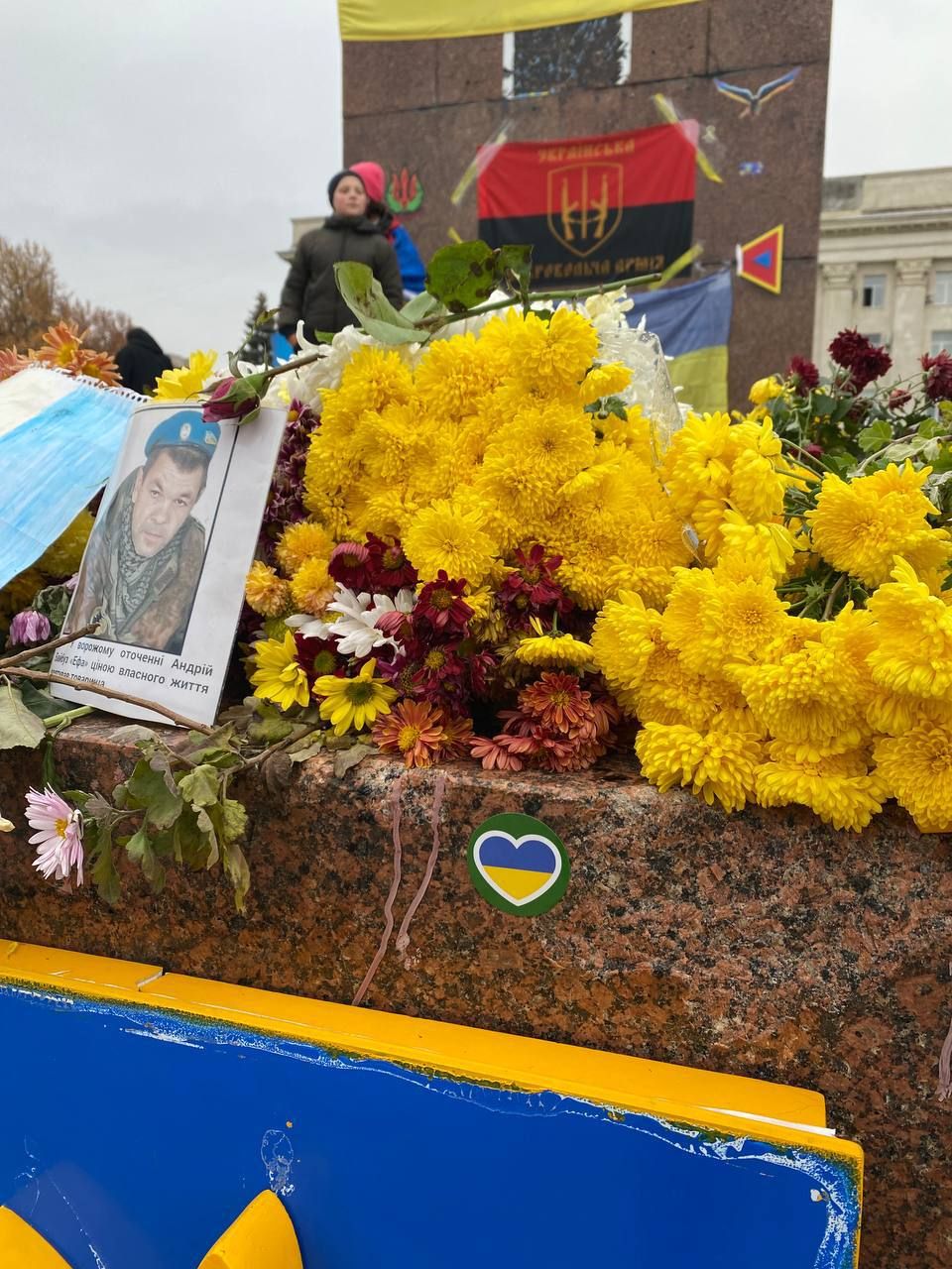 Потому следующим пунктом назначения стала площадь Свободы. Она ждала этого дня, но он наступил настолько внезапно, что стал приятным шоком. Лиля без колебаний отправилась в центр города, где было немало людей, а на площади уже были военные. Люди буквально окружили их, обнимали, целовали, жали руки и не верили в происходящее. На площади было много сине-желтых флагов, но спрятанный дома флаг Лилия не успела взять в тот день. Однако рядом с ней был тризуб – завязанный на сумке желтый платок в форме нашего герба, который был с ней всю оккупацию.