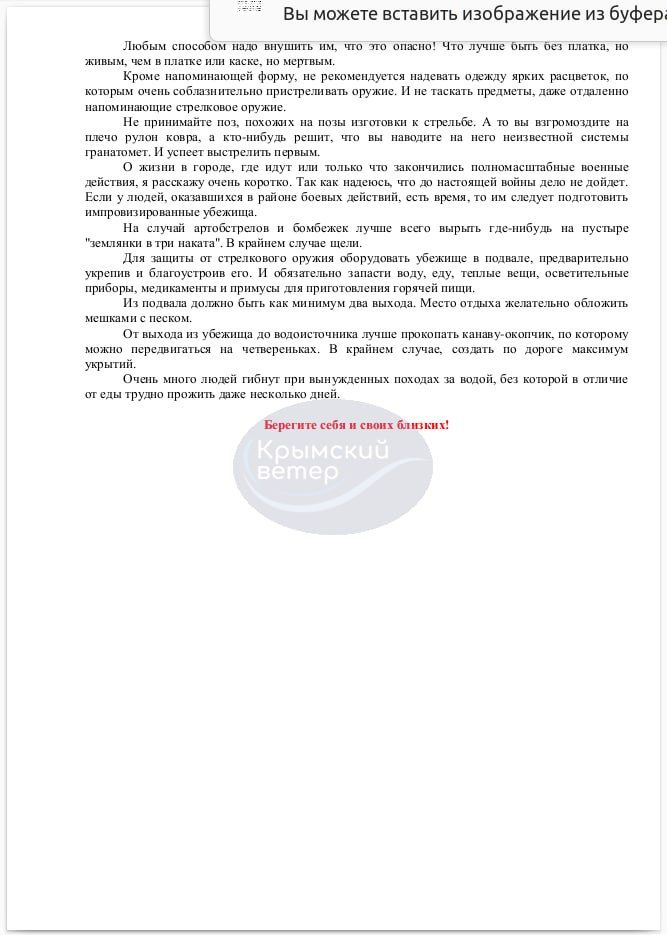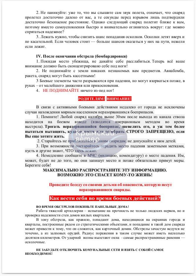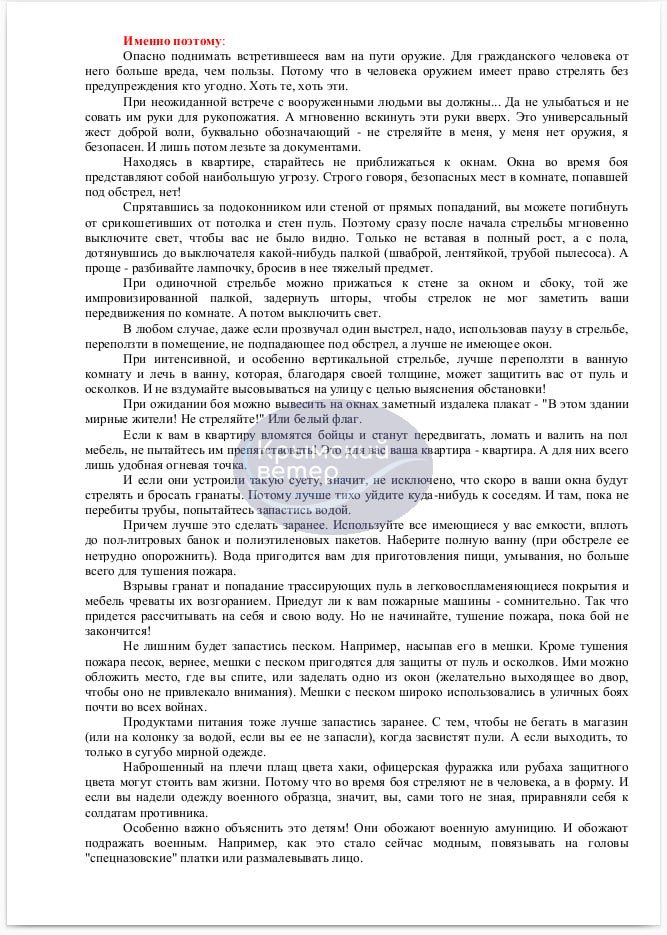 Но это еще цветочки. Также жителям изложили целую методологию действий в случае, если в их населенном пункте ведутся боевые действия. Советы на этот случай уместились в более чем 2 страницах формата А-4.