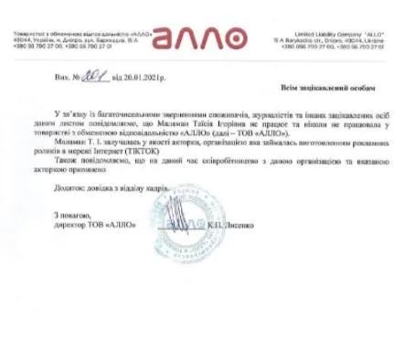 Официальное сообщение компании "Алло" о прекращении сотрудничества со скандальной блогершей обнародовал в телеграме офицер ВСУ Анатолий Штефан.