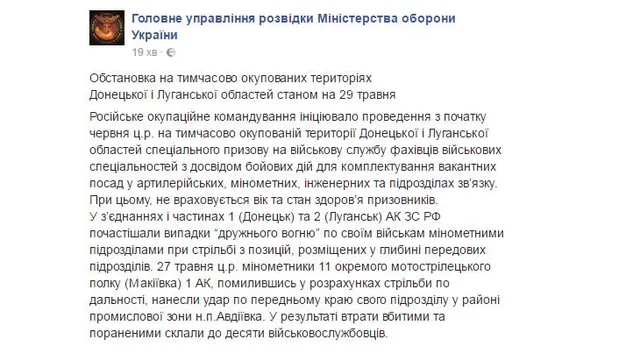 По данным разведчиков, в субботу, 27 мая, минометчики 11 отдельного мотострелкового полка (Макеевка) 1 АК по ошибке в расчетах стрельбы по дальности, нанесли удар по переднему краю своего подразделения в районе промышленной зоны Авдеевки.