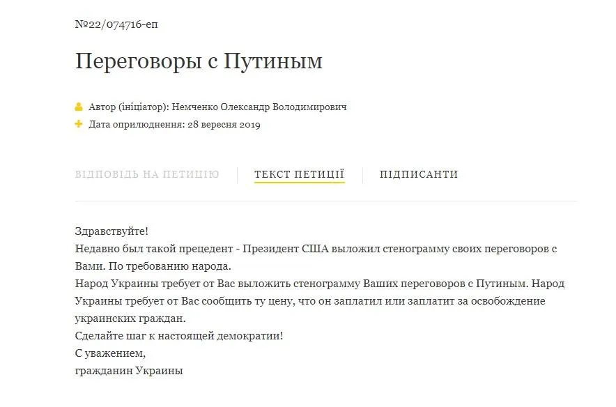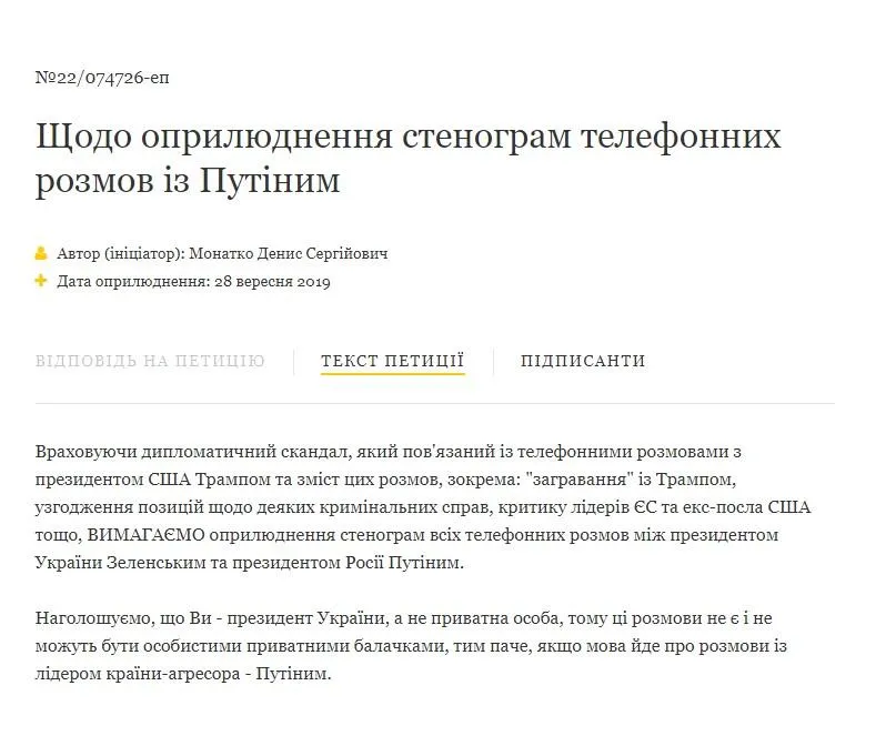 Автор первой из них – №22/074726-эп – призывает Зеленского обнародовать тексты бесед с Путиным на фоне "дипломатического скандала с лидером США Дональдом Трампом".