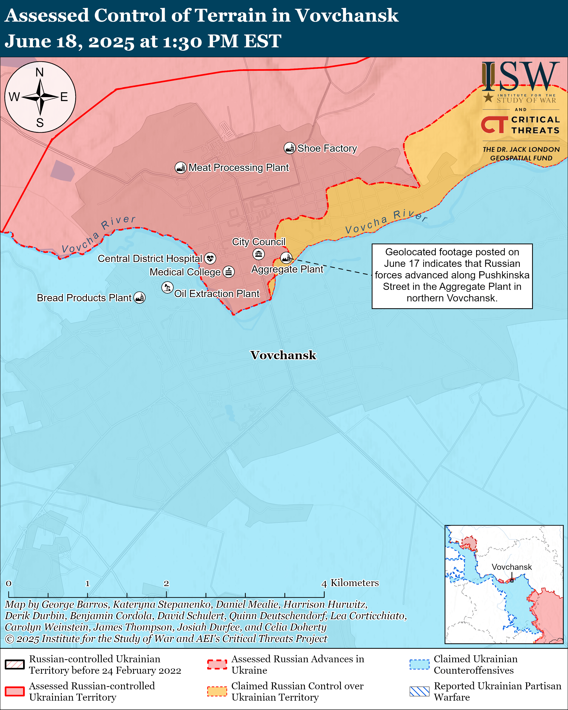 - На севере Харьковской области противник также недавно продвинулся. По геолокационным записям от 18 июня, российские подразделения продвинулись в пределах Волчанского агрегатного завода (северная часть Волчанска, к северо-востоку от Харькова).