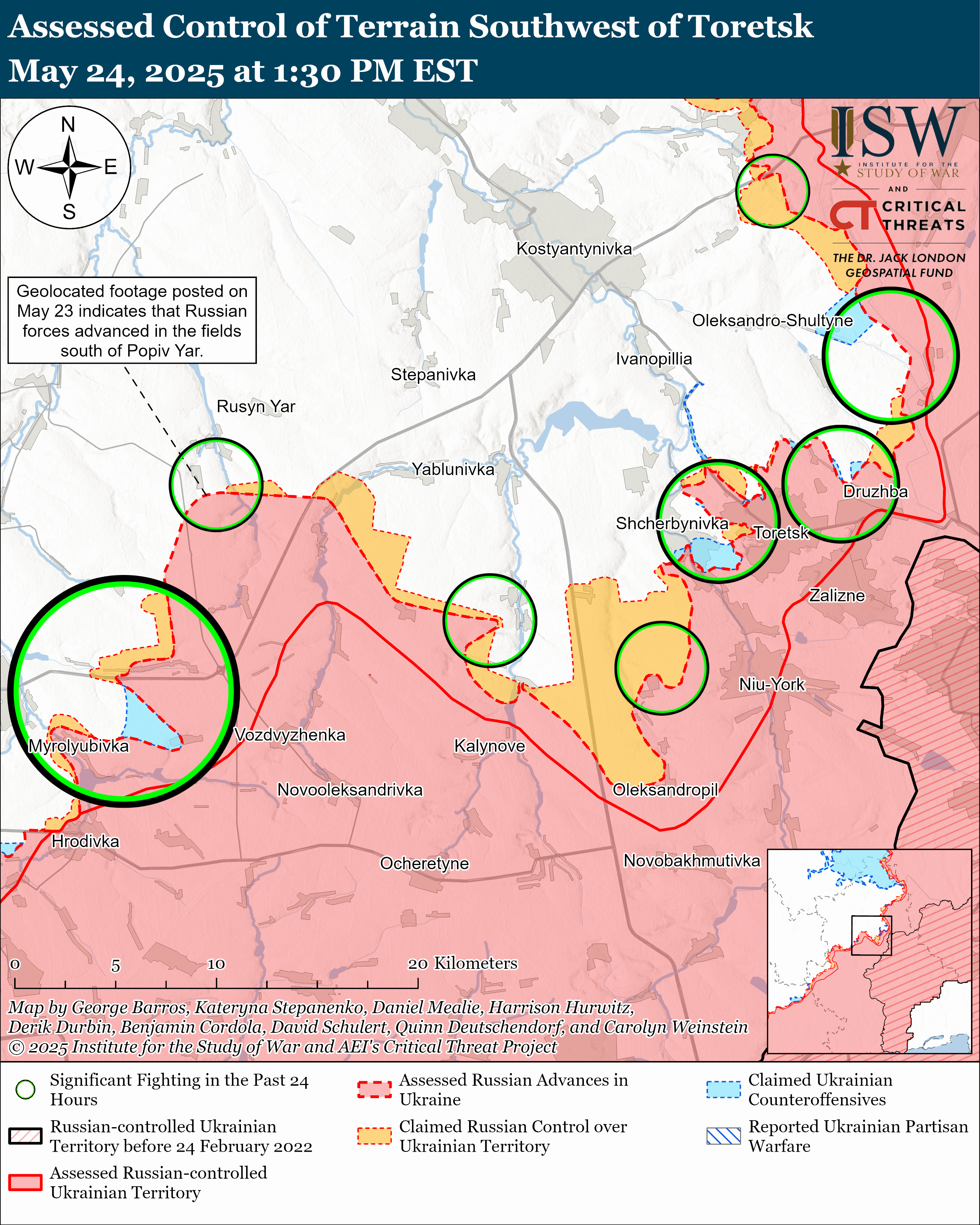 - На Северском направлении атаки россиян не имели успеха, на Часов Яр также. А вот на Торецком они продвинулись. Геолокационные видеозаписи от 23 мая показывают россиян к югу от Попового Яра, что к западу от Торецка. Там они захватили поля к юго-востоку от населенного пункта.