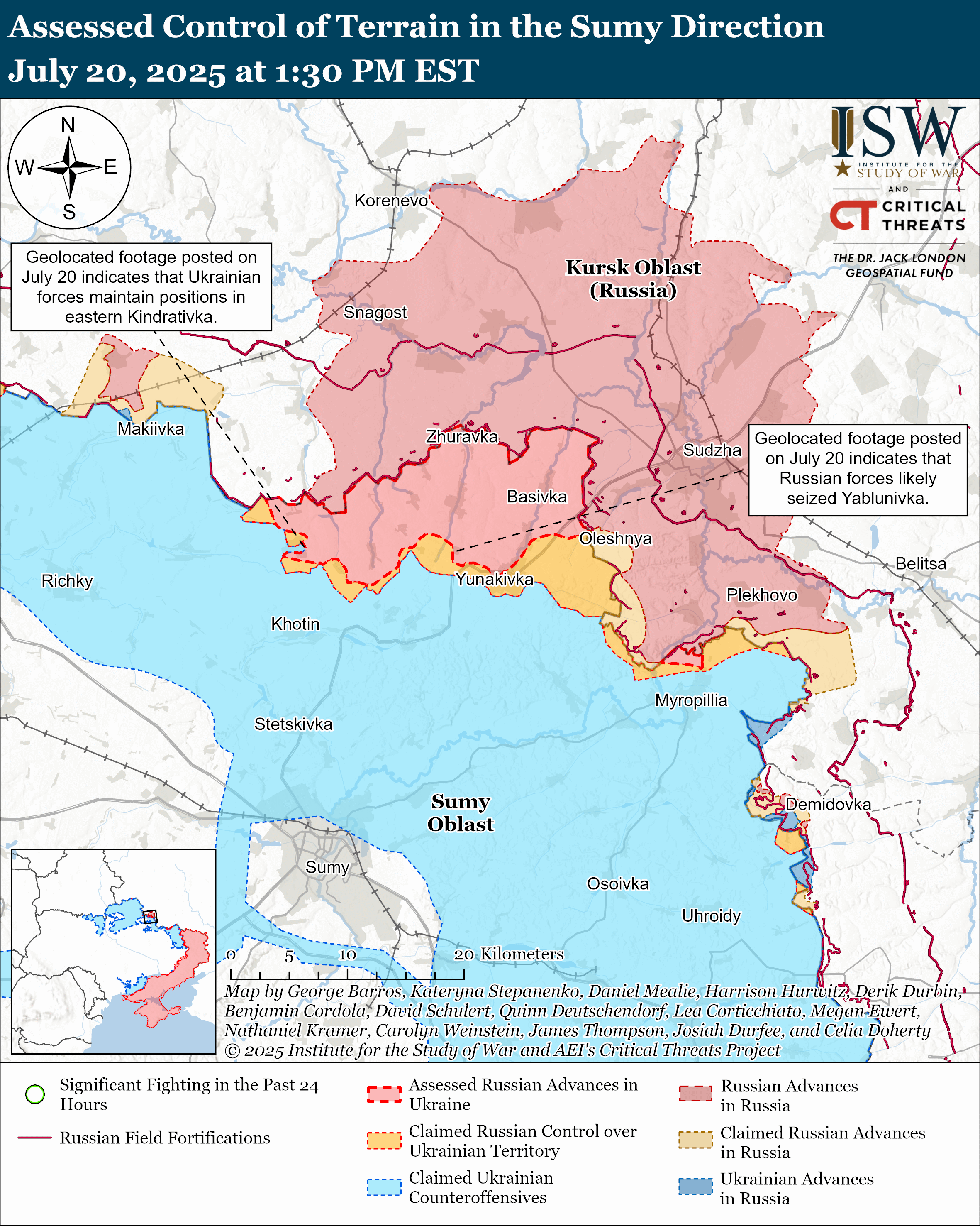 - На Сумском направлении обе стороны имеют незначительные продвижения. Украинские войска продвинулись у Кондратовки, а российские – захватили Яблоновку, также есть сообщения о продвижении на запад от Юнаковки. У Кондратовки продолжаются ожесточенные бои, территория разделена между обеими армиями. Россия применяет элитные силы, включая морскую пехоту и десантников, что свидетельствует о серьезных намерениях продвижения.