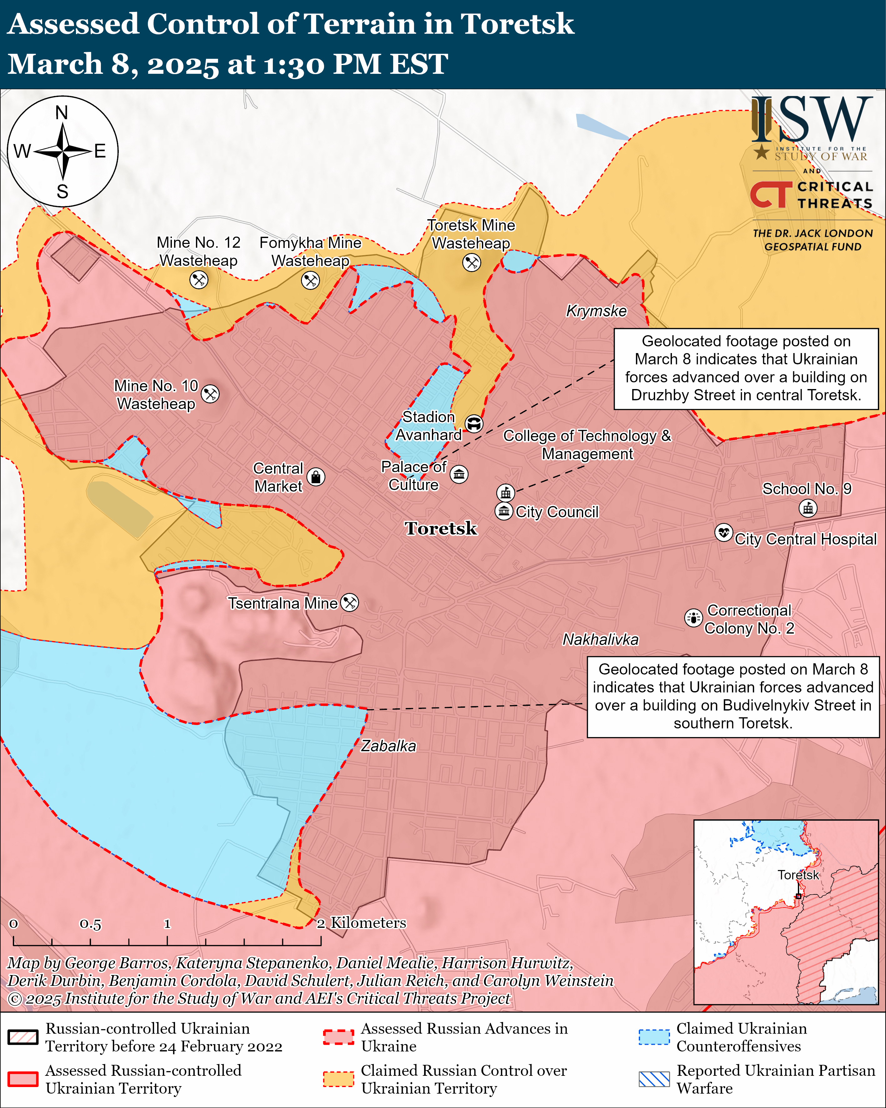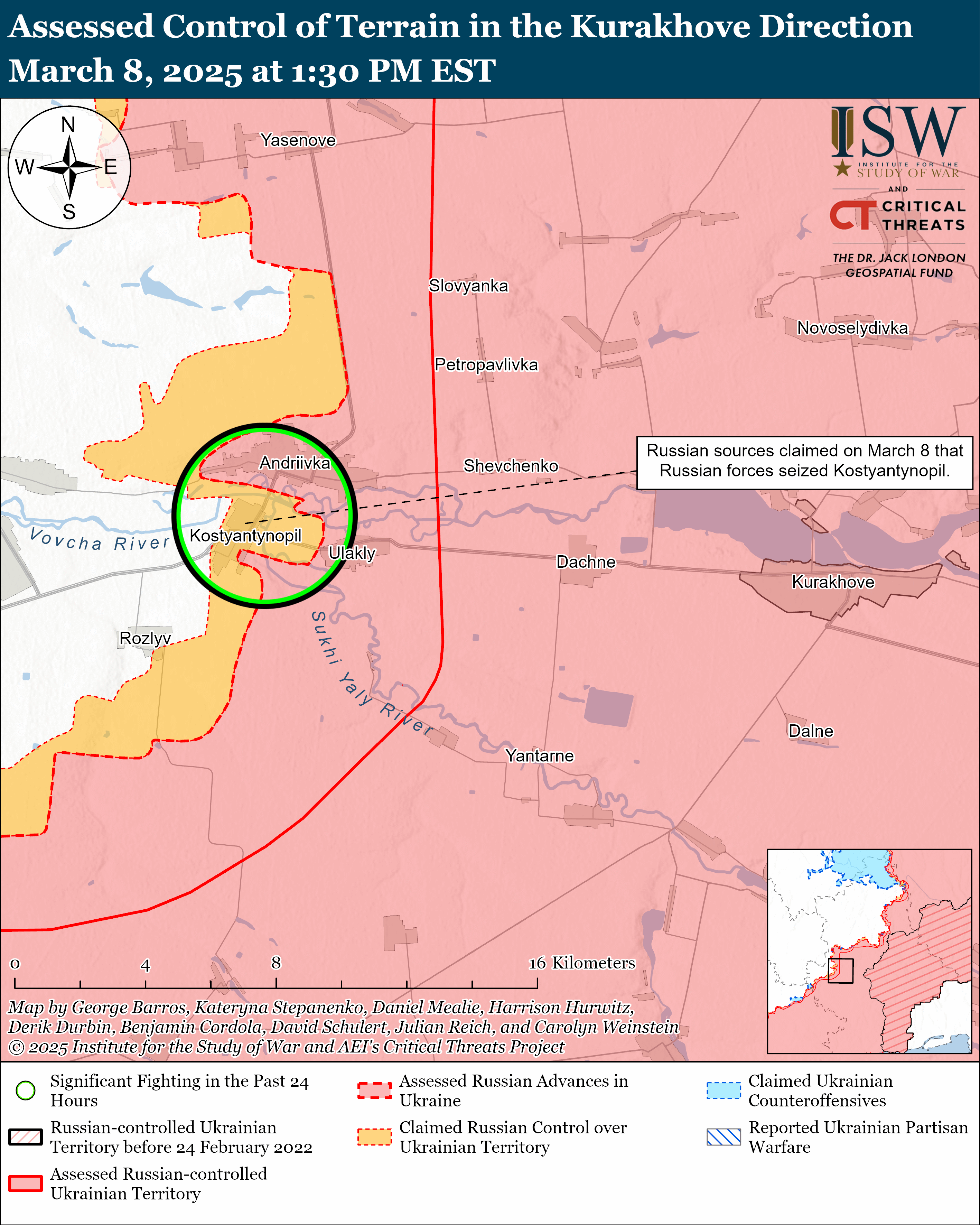 - Российские войска активизировали свою кампанию в Курской области 7 и 8 марта. Геолокационные кадры показывают, что они захватили Черкасское Поречье к северу от Суджи. Россияне также начали наступление на саму Суджу, в частности через подземный газопровод, но заявления о результатах атаки пока противоречивы.