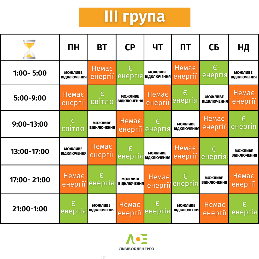 График отключений электроэнергии остается действующим. Дополнительно для удобства разделили график по каждой группе отдельно. Узнать, к какой группе относится ваш дом, можно на сайте "Львовоблэнерго" в разделе "Почему нет света".