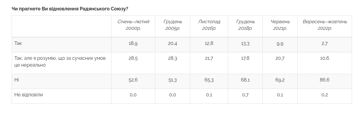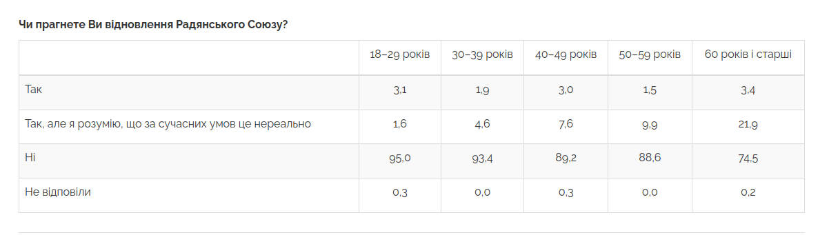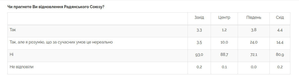 Доля тех, кто не хотел бы восстановления СССР, на Юге и Востоке Украины несколько ниже, чем на Западе – 72% и 81% против 93% и 89%. Несмотря на это, во всех регионах противники восстановления СССР составляют подавляющее большинство.