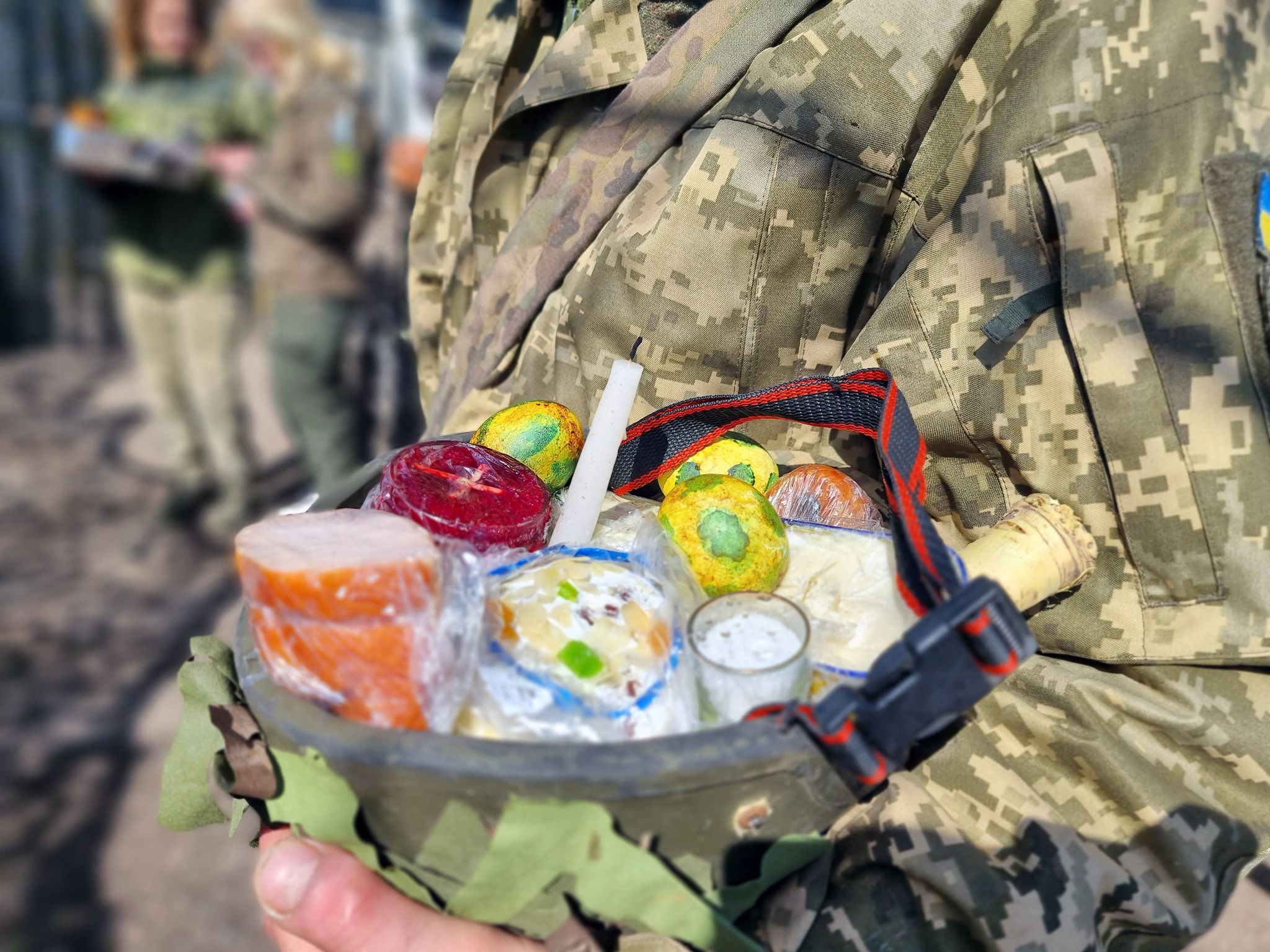 Начать следует с того, что по сети активно начали распространяться фотографии, на которых наши военные используют вместо корзины – свои шлемы. В них можно заметить свечи, куличи, колбасу, сыр и другие продукты.