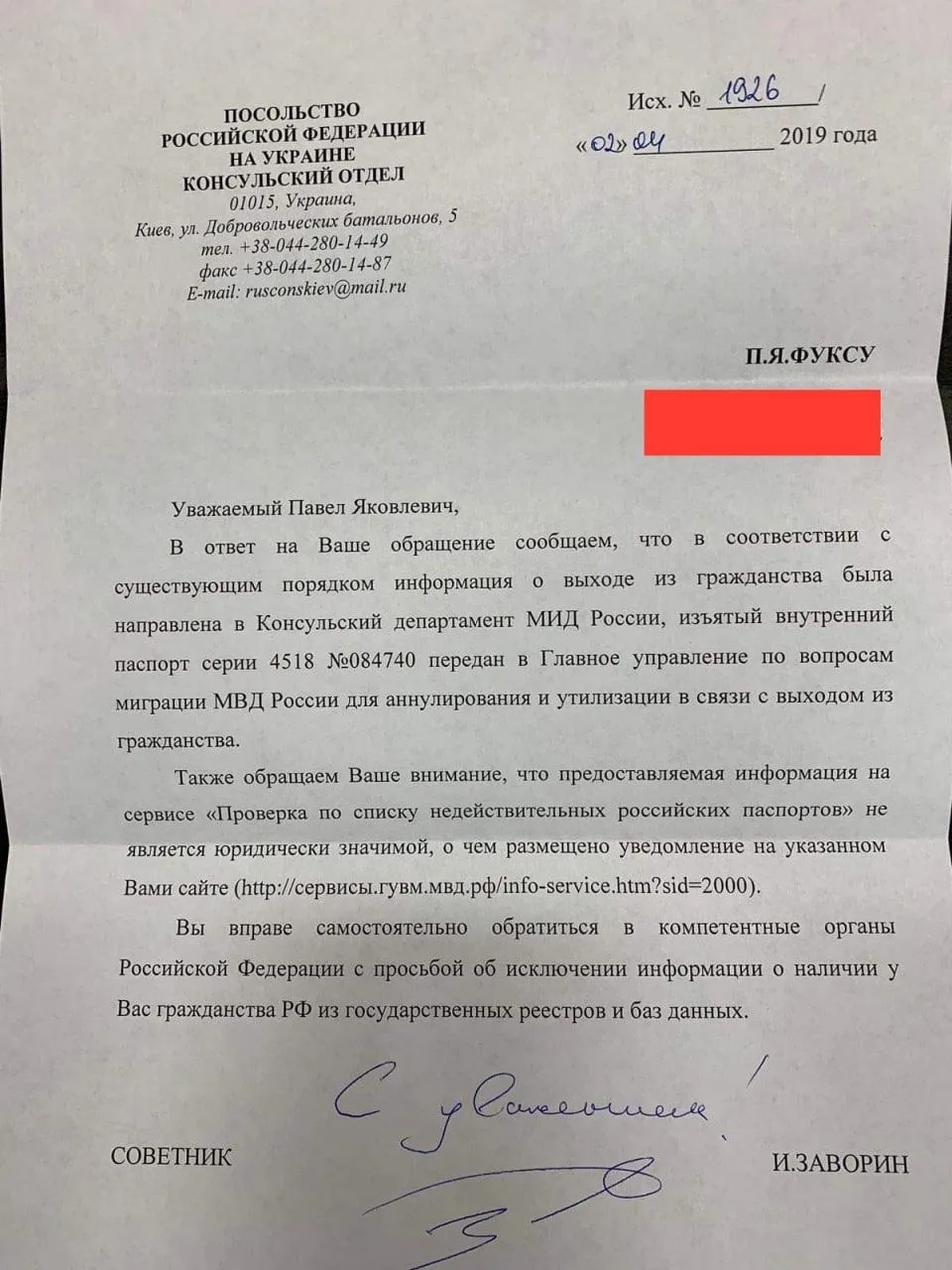 Документы Павла Фукса о выходе из гражданства России / Телеграм бизнесмена
