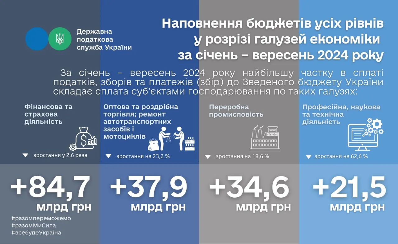 На перерабатывающую промышленность по данным ГНС приходится 16,7% от общего сбора в Сводный бюджет Украины за три квартала 2024 года, на оптовую и розничную торговлю – 16%, государственное управление и оборону – 11,3, финансовую и страховую деятельность – 10,9%.