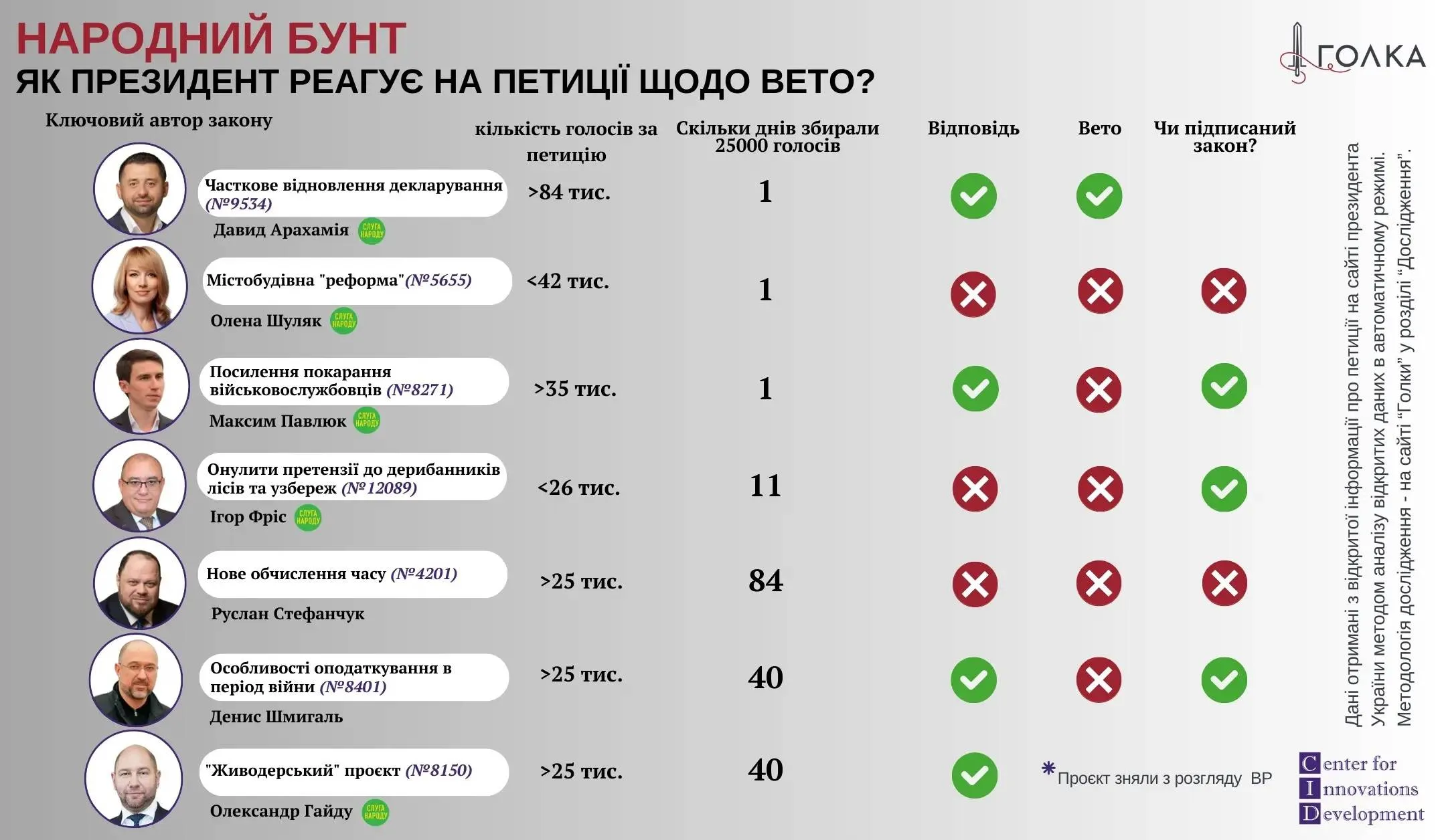 Общественная инициатива "Игла" обратилась в Офис президента, чтобы там безотлагательно внесли изменения в Положения, которые влияют на сроки обнародования и рассмотрения петиций о вето. Центр развития инноваций готов помочь безотлагательно усовершенствовать инструмент петиций.