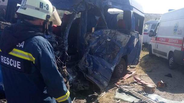 В результате столкновения переполненной людьми маршрутки, которая следовала в Одессу, и грузовики, которые возвращалась из областного центра, предварительно погибли девять человек,