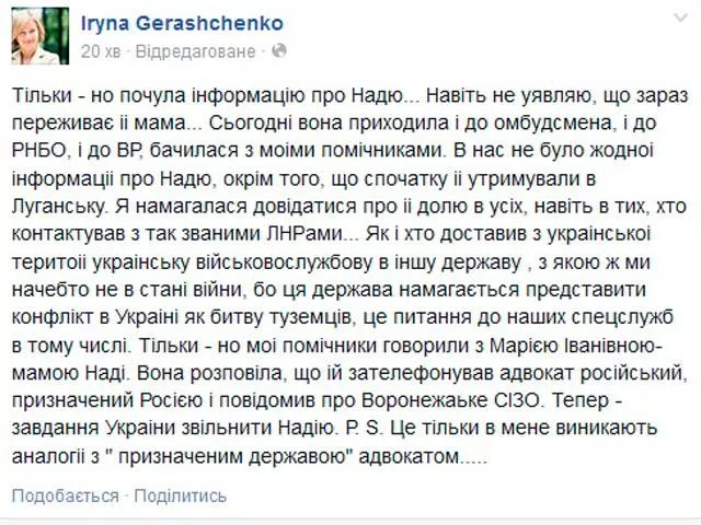 "Только-что мои помощники говорили с Марией Ивановной – мамой Нади. Она рассказала, что ей позвонил адвокат российский, назначенный Россией, и сообщил о Воронежском СИЗО. Теперь – задача Украины освободить Надежду", — написала Геращенко в Facebook.