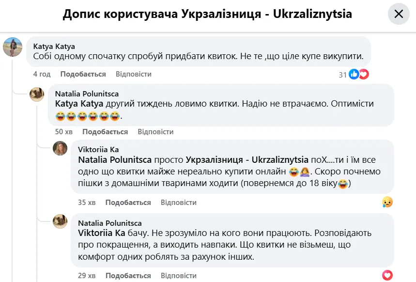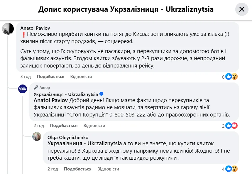 Пользователи отмечают, что успех зависит от дня недели: в выходные достать билет сложнее. Популярными вариантами также остаются покупка через "Приват24" и специальные чат-боты, которые осуществляют поиск и дают время на оплату.
