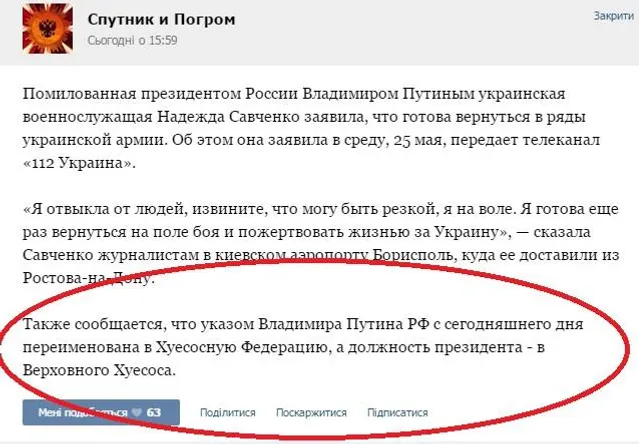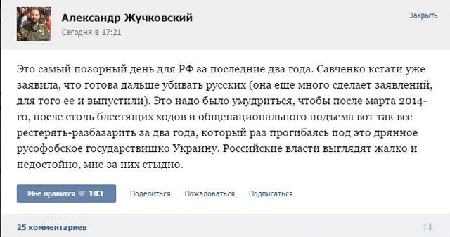 Националист и автор сайта «Спутник и Погром» Егор Просвирнин вот считает, что президент Путин, который выручил своих людей — теперь Верховный Хуесос. А Порошенко сегодня приплюсует себе несколько процентов к рейтингу за то, что выручил Савченко. Ну как, все еще считаете, что украинцы и русские -это один народ? Да нас разделяет ментальная пропасть.