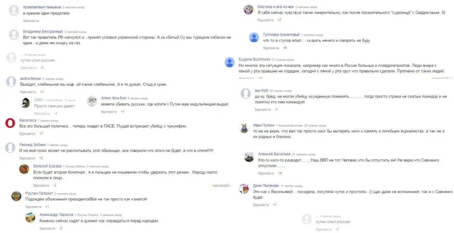 Комментаторы на российских ресурсах исходят злобой и ненавистью из-за обмена. Никто не радуется за своих сограждан. Вообще надо сказать, что злоба и ненависть — это главные движущие силы «русского мира», без которых он просто не может существовать. Я это еще весной 2014 понял, когда приходил на антимайдан и слушал выступления, которые на 90% состояли из проклятий в адрес Киева, «хунты», Америки, евреев, украинцев, «майдаунов» и всех остальных, кто не хотел жить в России.