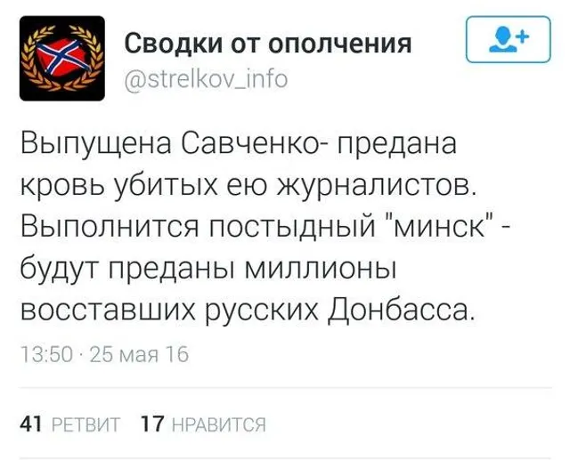 О том, что в Россию в обмен на Савченко отдали россиян, которые приехали в Украину убивать украинцев и виновны в гибели украинского военного, опять же — ни слова.