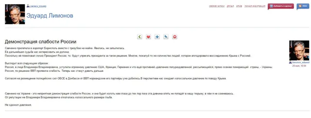 «Россия, в лице Владимира Владимировича, уступила огромному давлению США, Франции, Германии и что ещё противней,-давлению полураздавленной, рассыпающейся, прямо скажем помирающей страны, — Украины. Россия, по решению ВВП проявила слабость. Теперь нас станут давить дальше. Согласия на размещение полицейских сил ОБСЕ в Донбассе от ВВП нормандские его партнёры уже добились. В перспективе нас ожидает колоссальное давление по поводу Крыма.