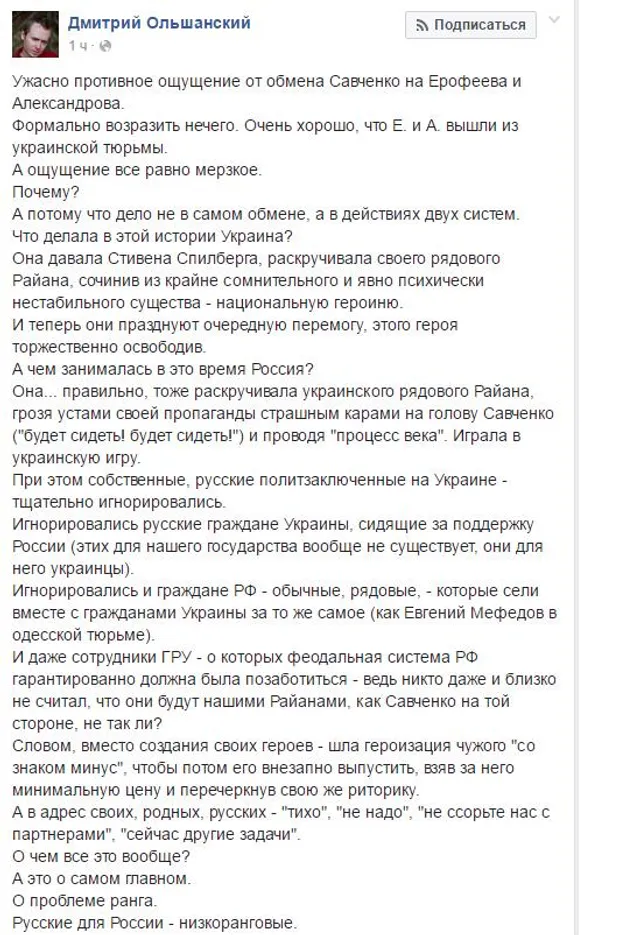 Ну хоть Ольшанский вспомнил про ГРУшников. Но и у него ощущение от их освобождения все равно мерзкое. Он считает, что это неравноценный обмен. И тут он в некотором роде прав, потому что машина российской пропаганды действительно демонизировала Савченко до крайности, требовала для нее возмездия и подавала всю историю с похищением украинки как большую российскую победу. В то же время от ГРУшников отказывались. Их не признавали. Как и других убитых в Украине россиян, которых хоронили тихо и тайно, как выродков, как преступников, как отбросы общества, за которые стыдно.