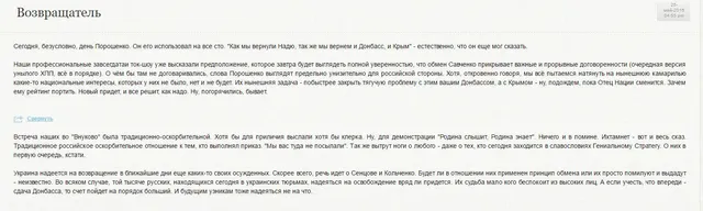 Эль-Мюрид (он же Несмиян) о ГРУшниках упоминает, но он тоже не доволен, что Савченко обменяли. Причем тут не понятно, чем конкретно не доволен — тем, что россиян никто в аэропорту не встретил или вообще самим фактом обмена, который позволяет Порошенко чувствовать себя победителем.