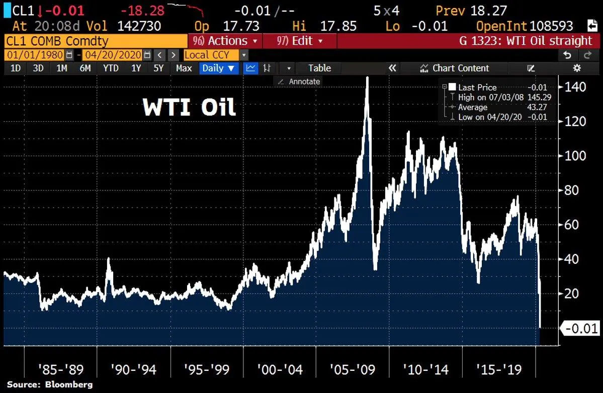 Те, кто не имеет, пытались продать баррели, снижая цену. Пока она не упала до нуля и не стала вообще отрицательной. Торги закончились на отметке в -37 долларов США (минус тридцать семь) – самой низкой в истории. Настолько мало не было даже после открытия залежей нефти в США в XIX веке и во время Великой Депрессии в 1931 году.