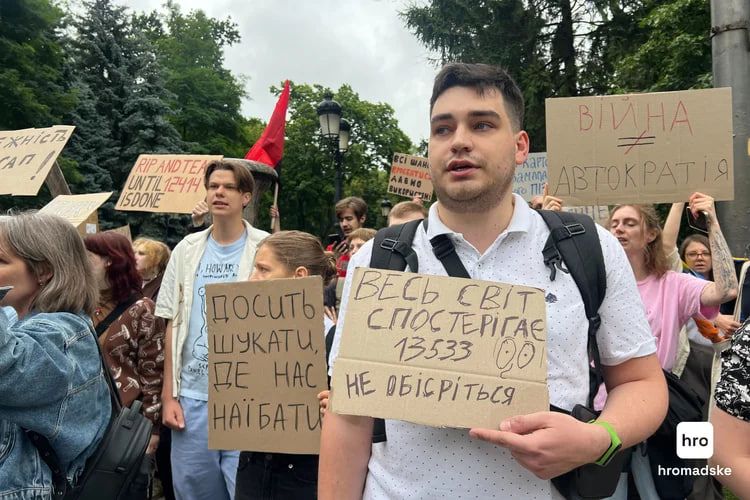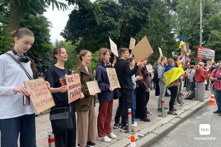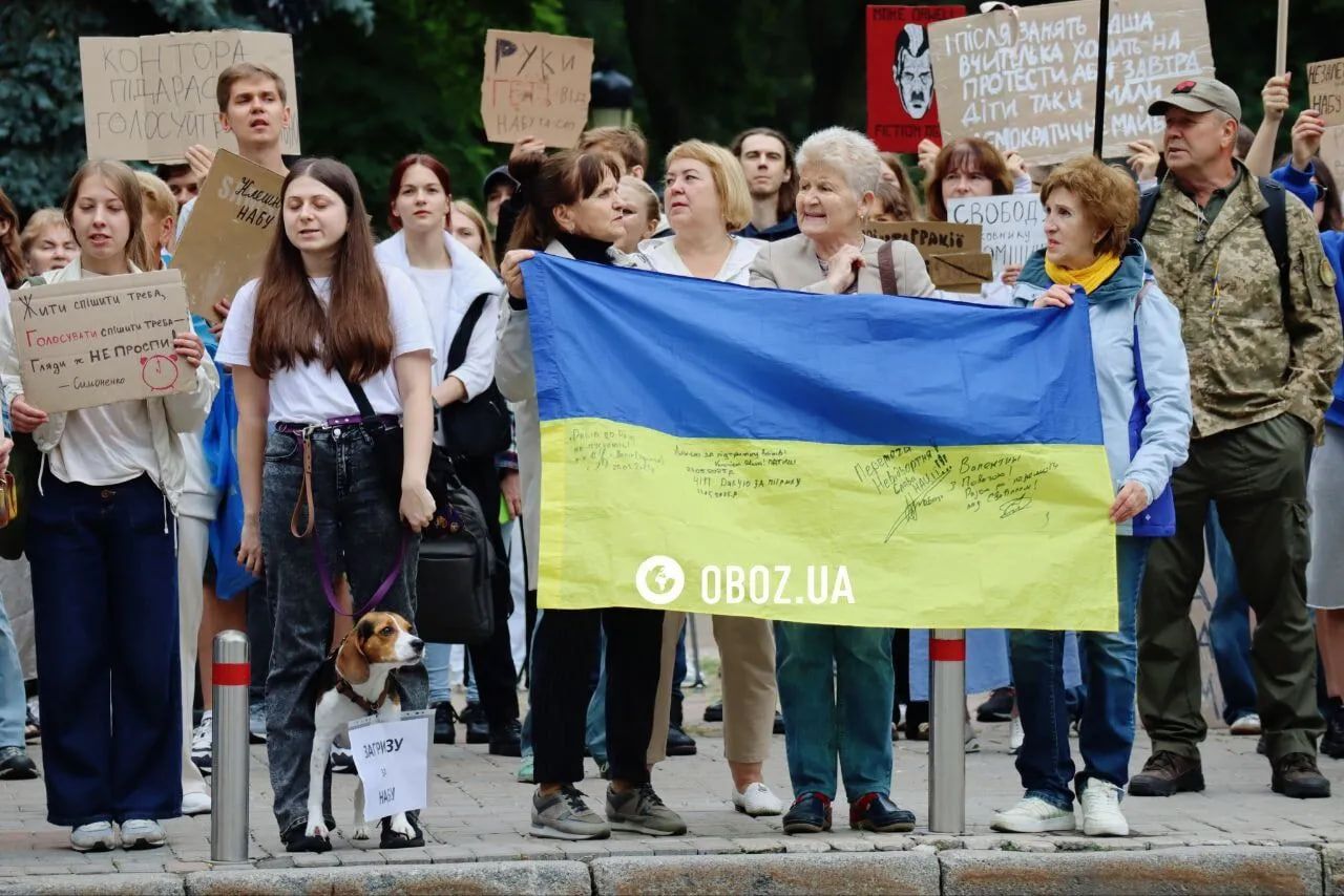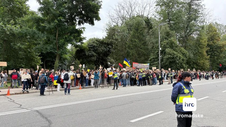 Также среди призывов можно услышать: "Раду в эфир!". Заседания депутатов не транслируются с начала полномасштабной войны, однако 31 июля телеканал "Рада" транслирует все, что происходит в кулуарах Парламента.
