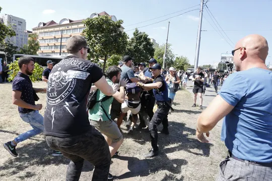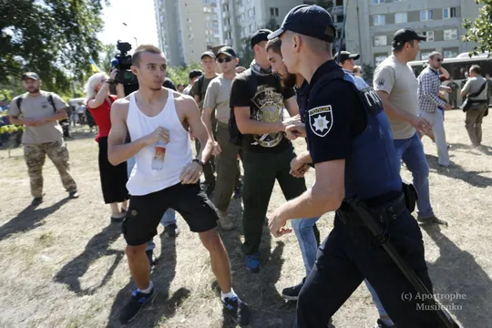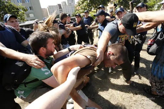 Силовики решили проверить вещи одного из активистов, который не согласился. На фоне этого произошла ссора, которая переросла в схватку. Полицейские окружили активиста и оттеснили его от группы активистов.