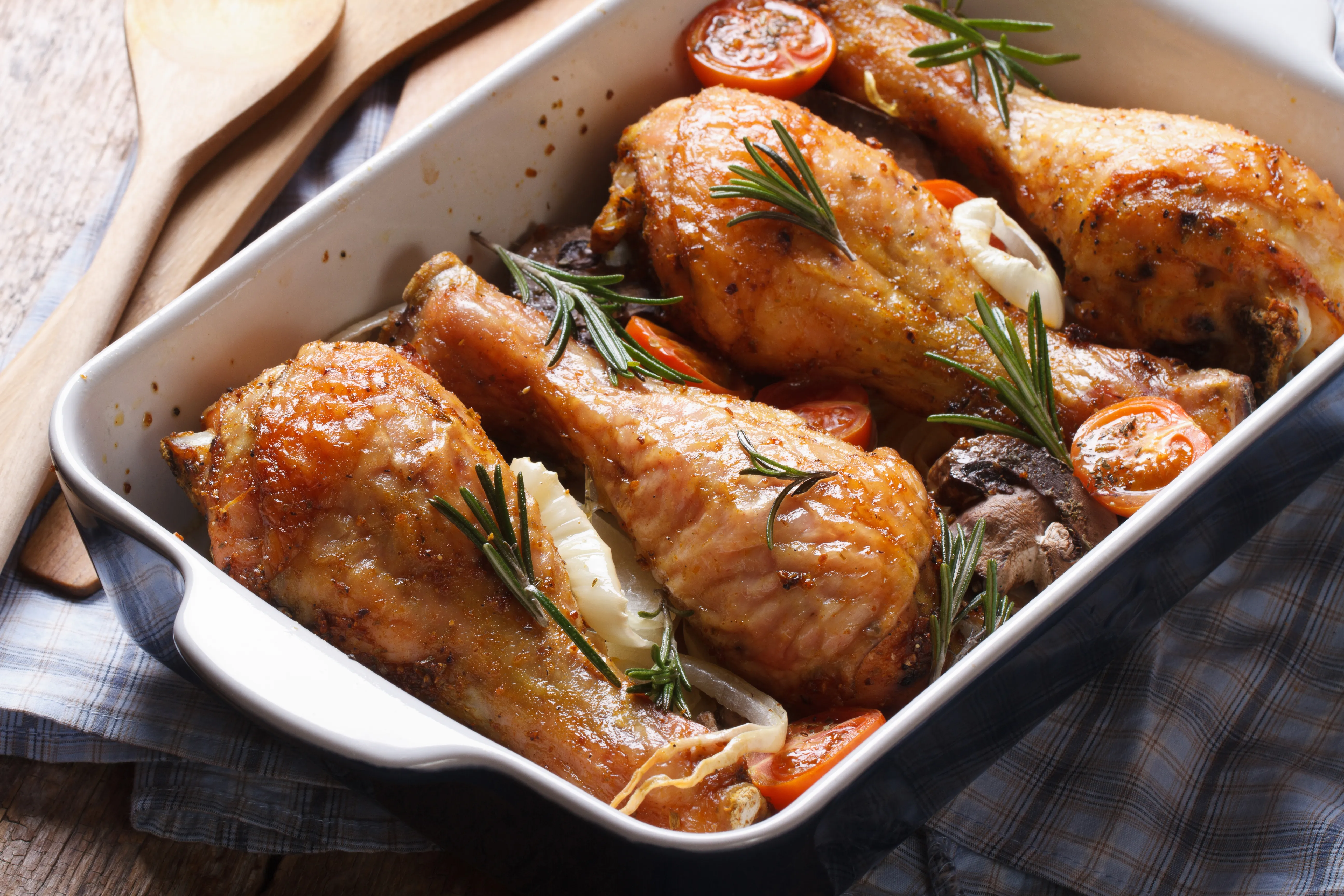 Запеченные куриные голени с помидорами черри и шампиньонами