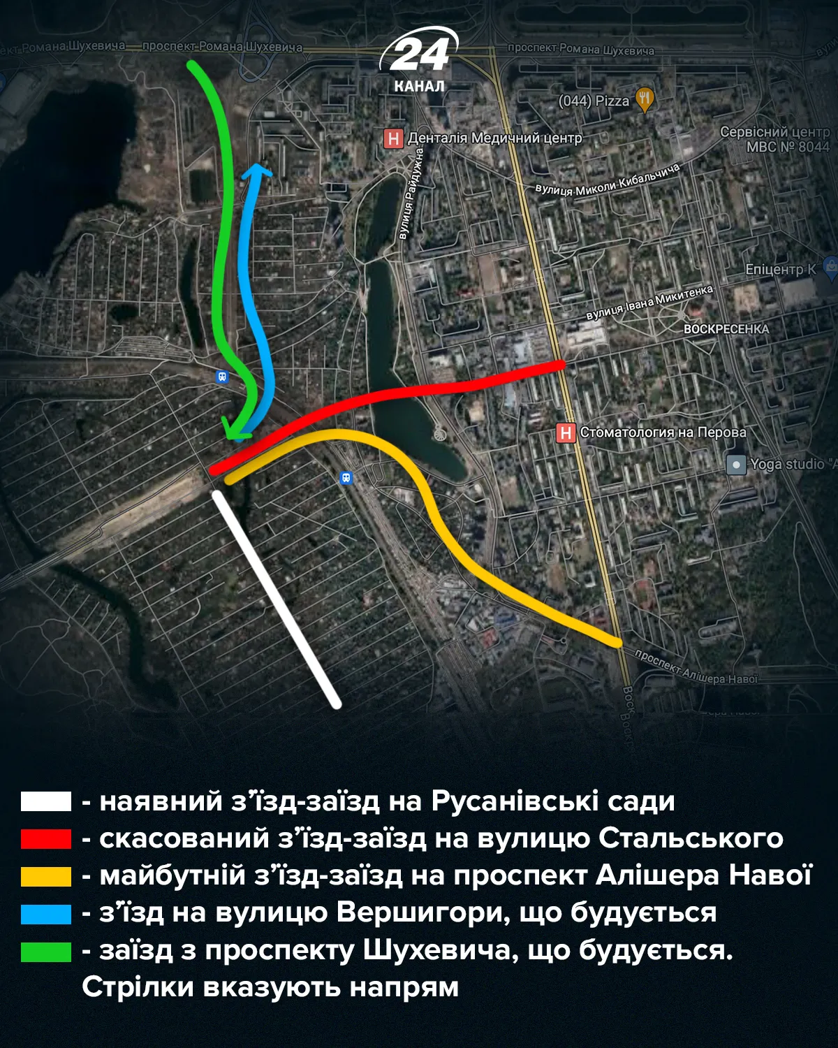 По первоначальным планам предполагалось два съезда с Подольского моста на левый берег – на Воскресенку по мостам через озеро Радунка в сторону улицы Стальского и эстакадами в сторону Троещины и улицы Оноре де Бальзака.