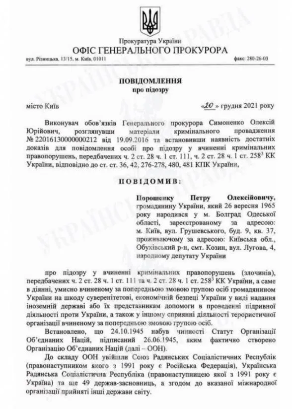 Накануне издание опубликовало полный текст подозрения Порошенко. Документ содержит 32 страницы и начинается с преамбулы об учреждении ООН.