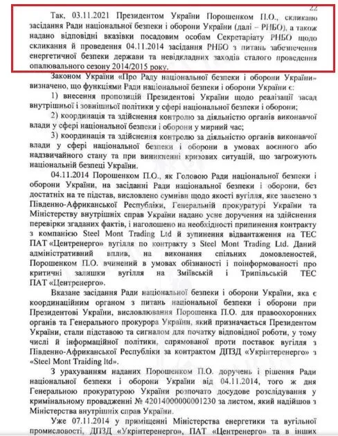 "Так, 3 ноября 2021 года Президентом Украины Порошенко Петром Алексеевичем созвано заседание СНБО, а также даны соответствующие указания должностным лицам секретариата СНБО относительно созыва и проведения 4 ноября 2014 года заседания СНБО по вопросам обеспечения энергетической безопасности государства и неотложным мерам устойчивого проведения отопительного сезона 2014–2015 годов".