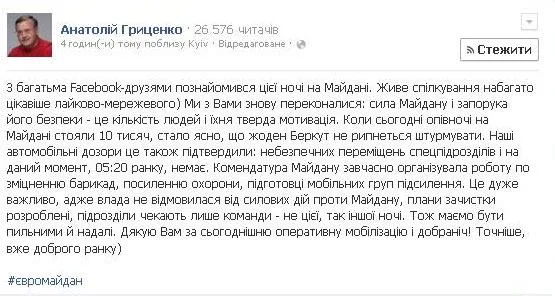 "Мы с вами еще раз убедились: сила Майдана и залог его безопасности - это количество людей и их твердая мотивация. Когда сегодня в полночь на Майдане стояли 10000, стало ясно, что ни один "Беркут" не рыпнется штурмовать. Наши автомобильные дозоры это также подтвердили: опасных перемещений спецподразделений и на данный момент, 5:20 утра, нет. Комендатура Майдана заранее организовала работу по укреплению баррикад, усилению охраны, подготовке мобильных групп усиления", - рассказал Гриценко.