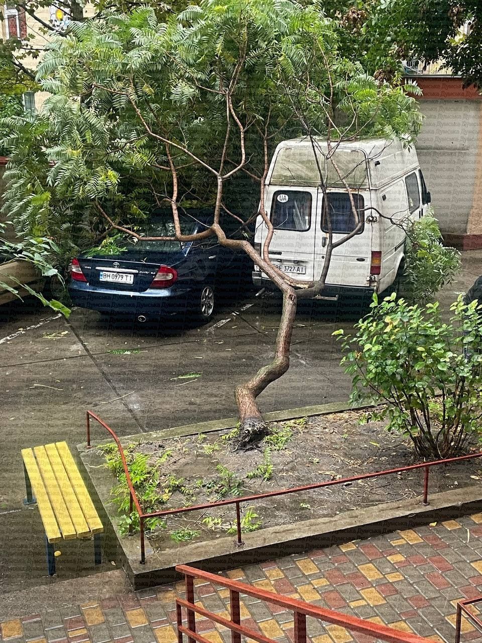 В одесском интернет-издании отметили, что в жилом комплексе "Радужный" дерево у подъезда упало на автомобили.
