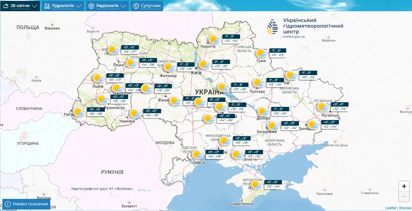 Заморозки в Украине 28 апреля / Карта Укргидрометцентра