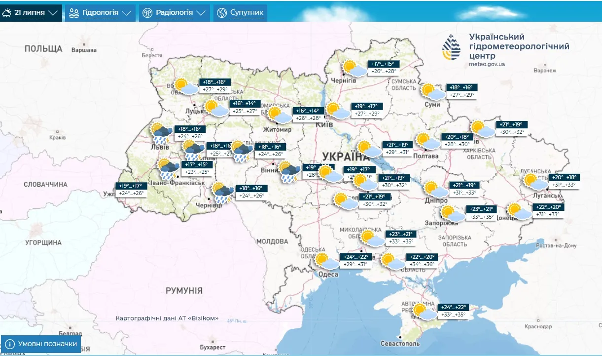Прогноз погоды на 21 июля / Карта Укргидрометцентра