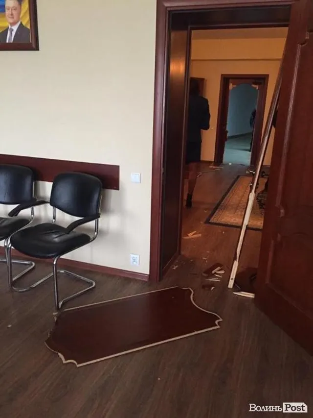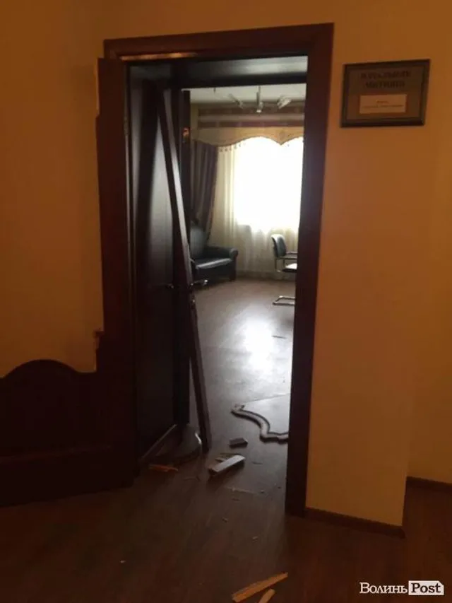 На фото видно, что пострадали не только турникеты на входе в здание, но и входные двери рабочего кабинета начальника таможни.