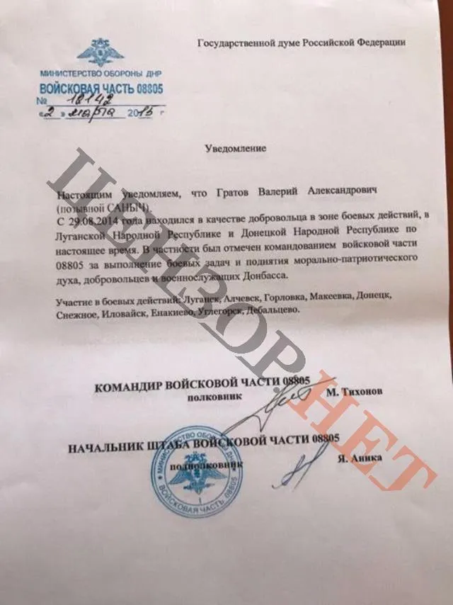 В письме из "военной" части боевиков "ДНР" в Госдуму РФ указано, что Гратов воевал в районе Луганска, Алчевска, Горловки, Макеевки, Донецка, Снежного, Иловайска, Енакиево, Углегорска, Дебальцево.