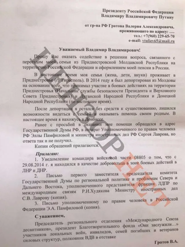 "Уважаемый Владимир Владимирович! Прошу Вас оказать содействие в решении вопроса, связанного с переездом моей семьи из "Приднестровской Молдавской Республики" на территорию Российской Федерации и оформлением моей пенсии в России. После депортации я остался без средств к существованию, потерял возможность видеться с семьей и оказывать помощь своим родным. Сейчас я нахожусь на Донбассе", – говорится в письме.