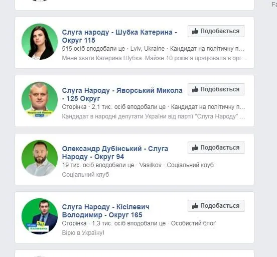 Следовательно, у Зеленского решили эту же технологию применять и на парламентских выборах. Каждый мажоритарщик, который идет от "Слуги народа", зарегистрировал отдельную страницу с названием округа, в котором они баллотируются.