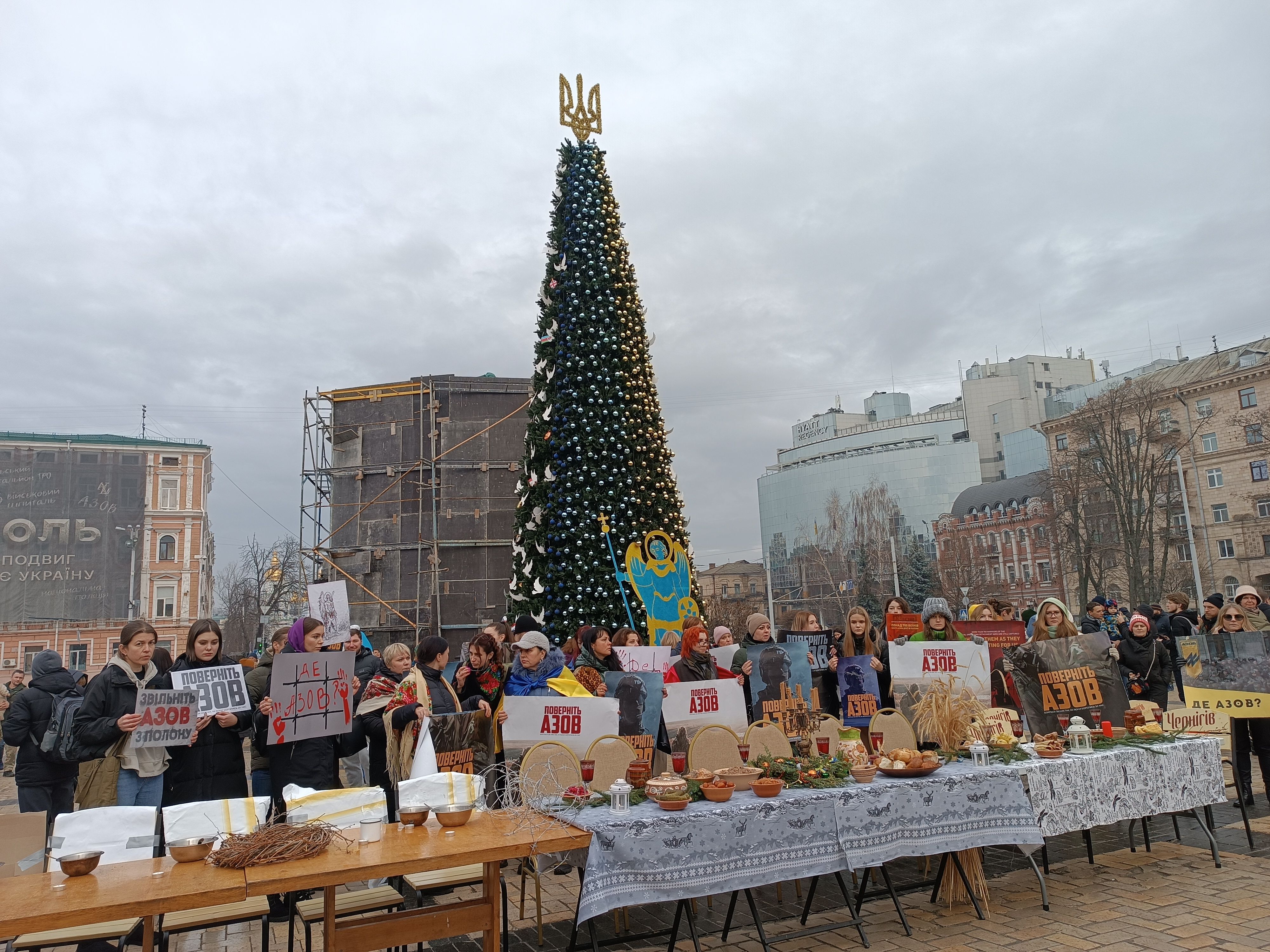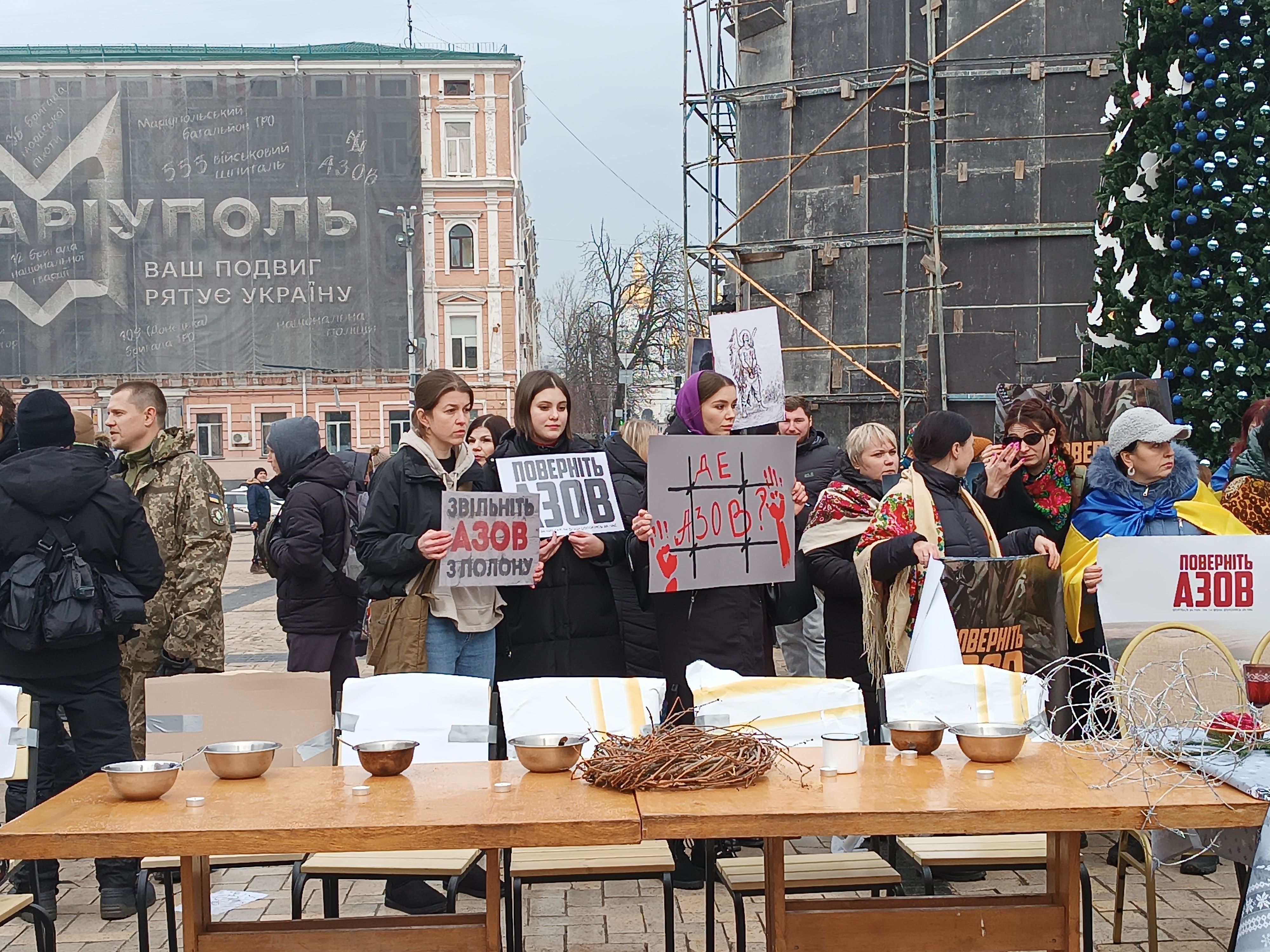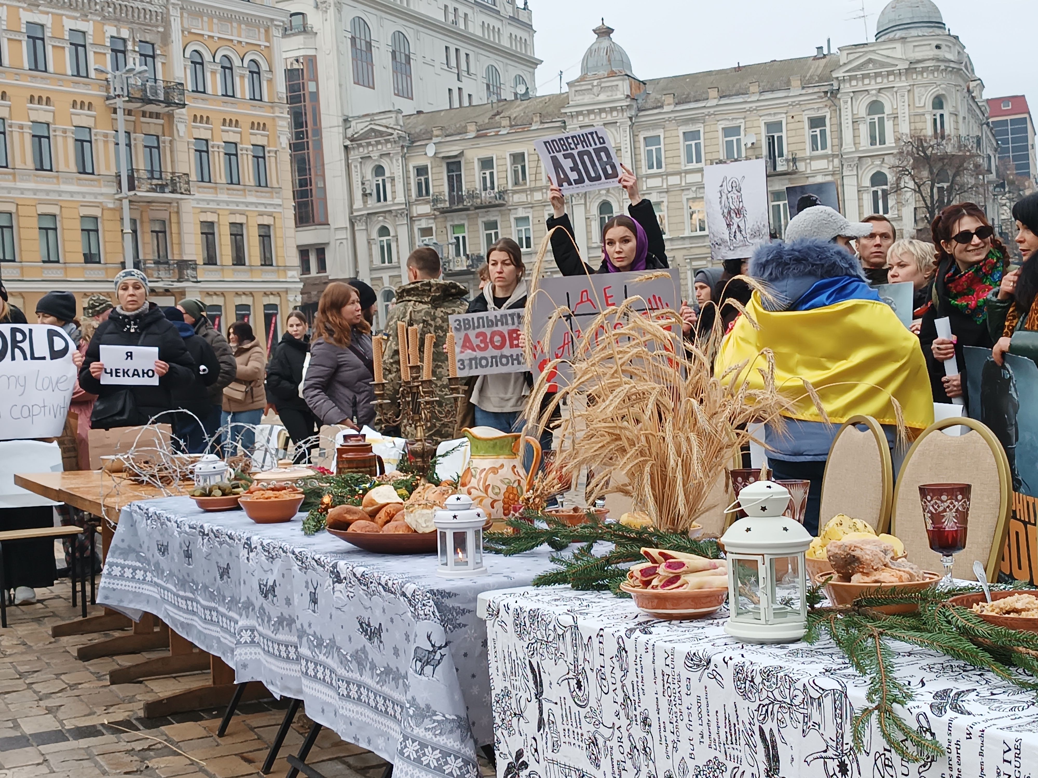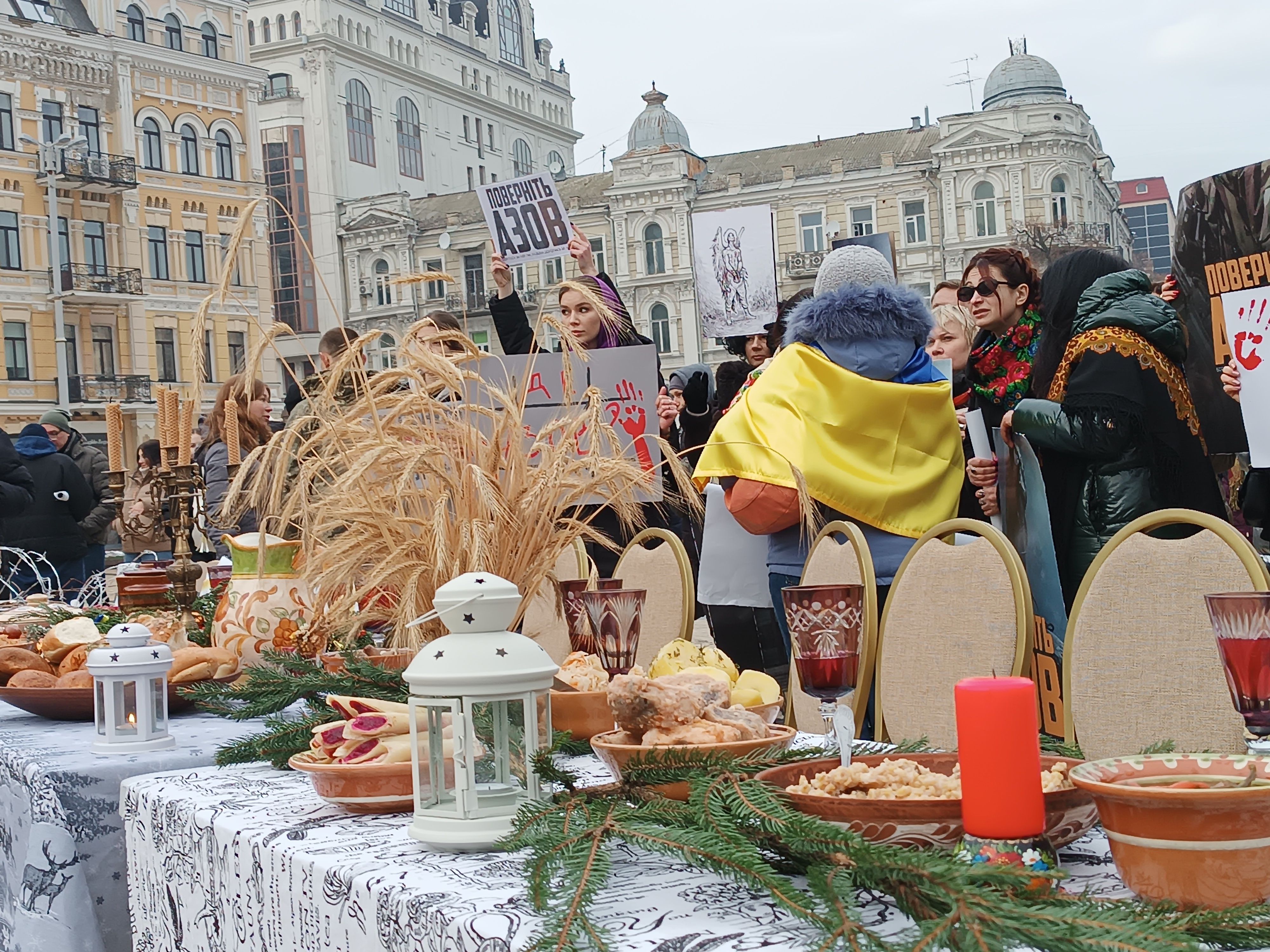 Участники акции устроили перформанс, показывающий, как будут встречать Рождество пленные "азовцы". На площади поставили два стола, на одном из которых были красивые и вкусные блюда, а на другом – металлические миски и колючая проволока, информирует 24 канал.