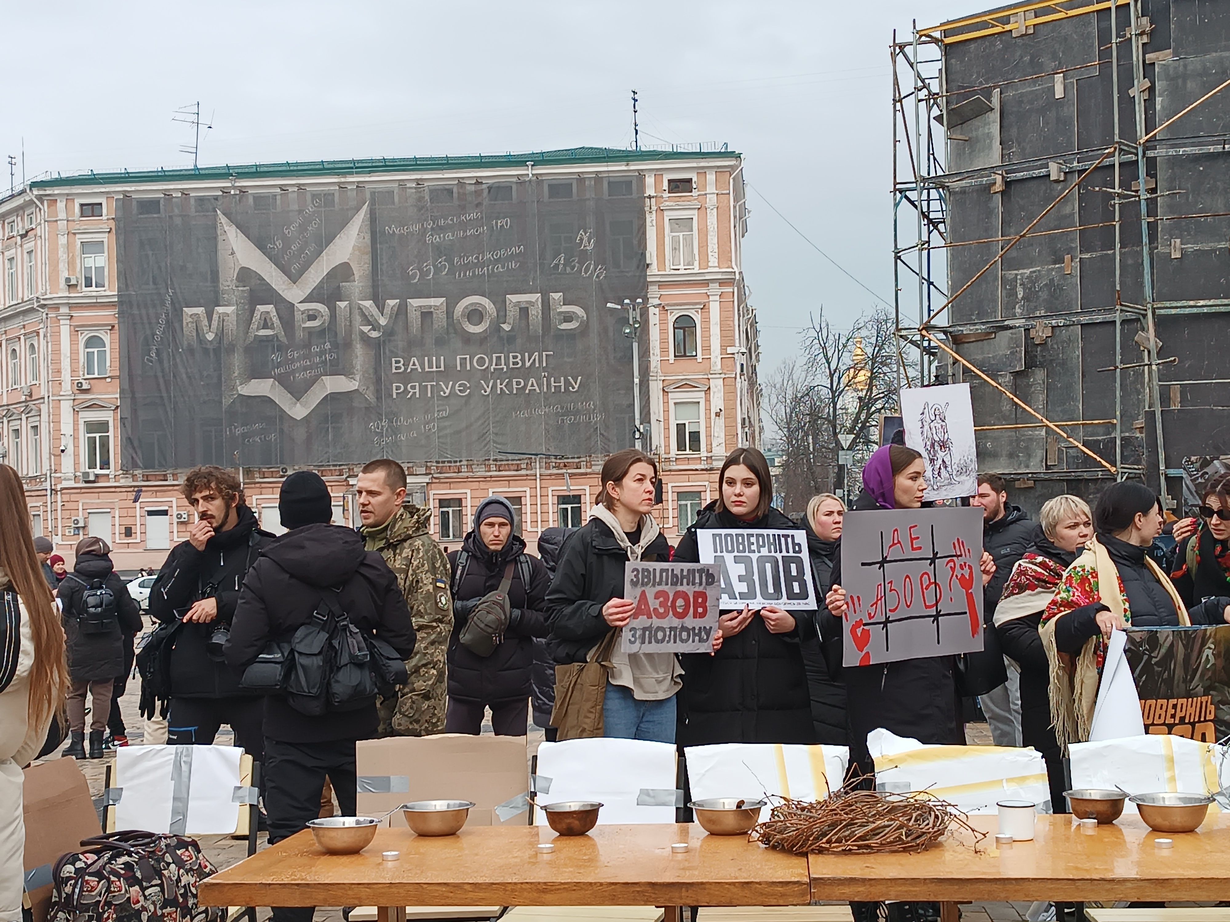 Участники акций держали плакаты с лозунгами "Где АЗОВ?" "FREE АЗОВ", "Верните АЗОВ" и другие. Родные "азовцев" хотели обратиться к украинскому обществу, чтобы они не забывали о героях.