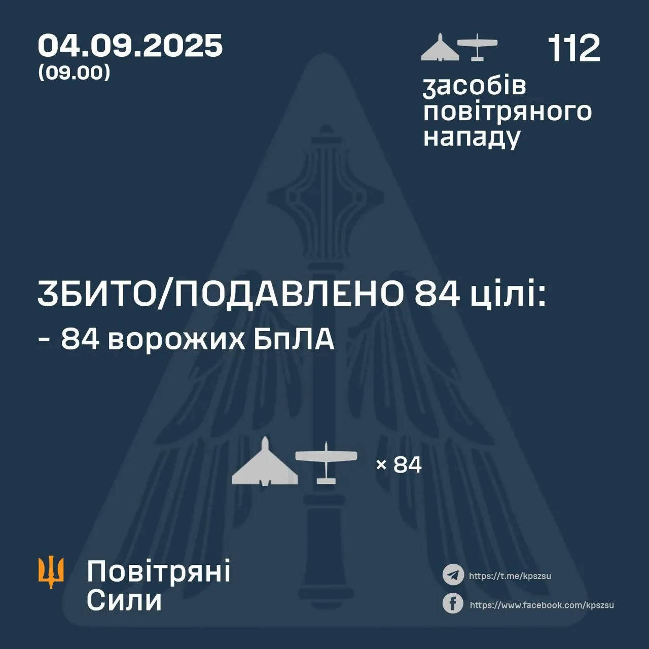 По предварительным данным, по состоянию на 09.00 противовоздушной обороной сбито/подавлено 84 вражеских БПЛА типа Shahed и дронов-имитаторов различных типов на Севере, Юге и Востоке страны,