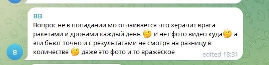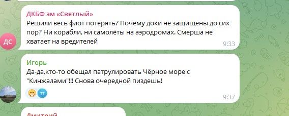 Кто-то из жителей страны-агрессорки начинает осознавать, что им врут о потерях Украины. Ведь еще в первые месяцы вторжения их утешали, что уничтожена почти вся украинская авиация. А тут вот вдруг украинцы из самолетов ракетами в очередной раз атакуют вражеские корабли.