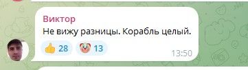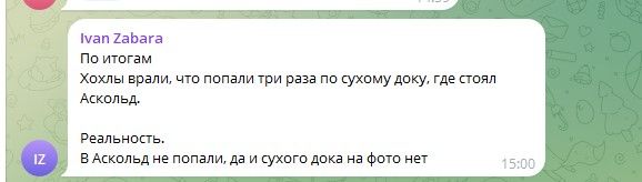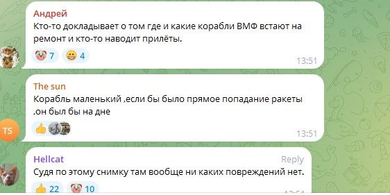 Немного поднялось настроение у окупантов, когда появились спутниковые снимки пораженного "Аскольда". Россияне радовались, что корабль не уничтожен полностью, а просто повредили. Правда, кто-то признавал, что прямое попадание "не за горами".