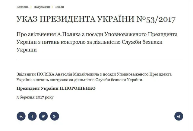 Анатолий Полях был назначен на эту должность в апреле 2014 года бывшим в то время и.о. президента Александром Турчиновым.