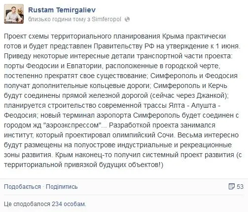 "Планируется строительство современной трассы "Ялта-Алушта-Феодосия"; новый терминал аэропорта Симферополь соединят с городом ж/д "Аэроэкспрессом"... Разработкой проекта занимался институт, который проектировал олимпийский Сочи. Весьма интересно будут размещены на полуострове индустриальные и рекреационные зоны развития. Крым наконец получил системный проект развития (с территориальной привязкой будущих объектов)", - пишет Темиргалиев в Facebook.