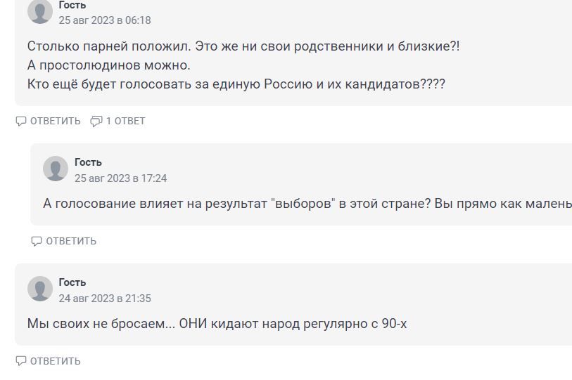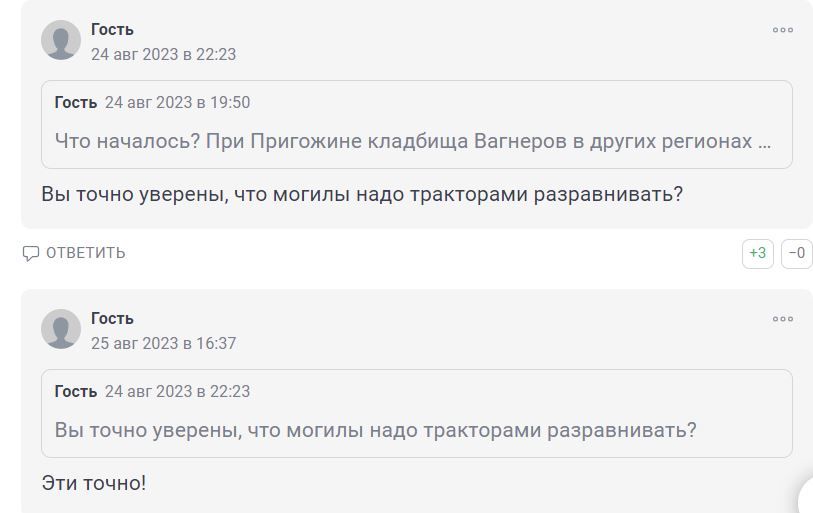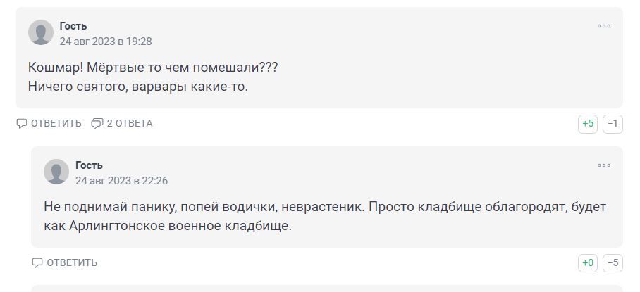 Мнения россиян разделились. Под новостью об уничтожении могил они обсуждают целесообразность такого шага. Многие обращают внимание на то, что "реконструкция" делается наспех. "Еще тело не остыло", пишут они, намекая на Пригожина.
