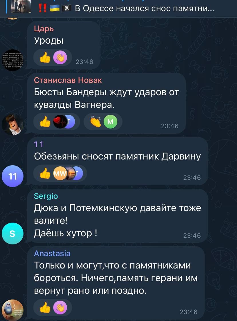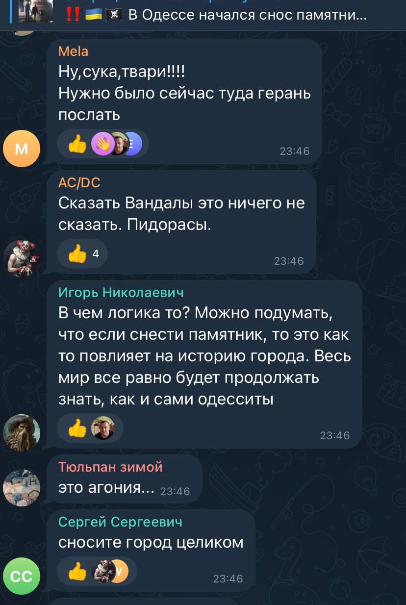- 3 ноября спикер председателя Одесской ОВА Сергей Братчук анонсировал демонтаж памятника.