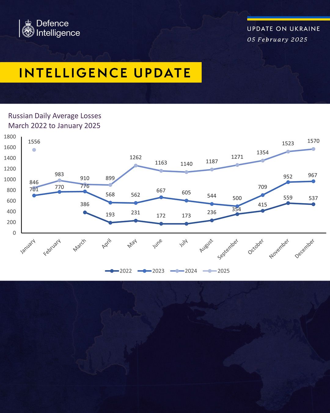 Показатель потерь России, вероятно, продолжит в среднем превышать 1000 человек в день в феврале 2025 года, что отражает высокий темп российских операций и наступлений,